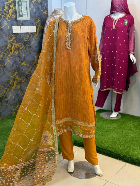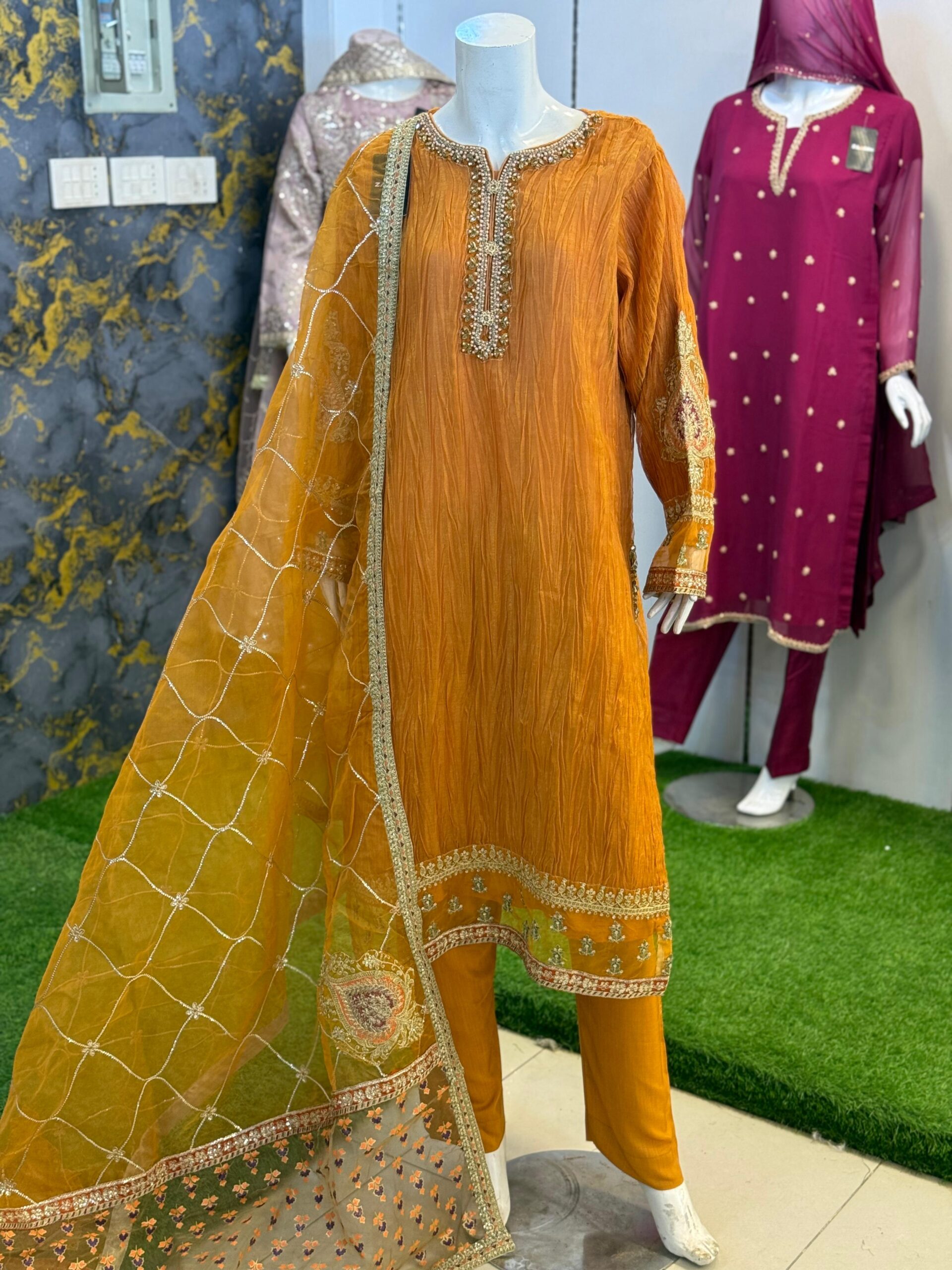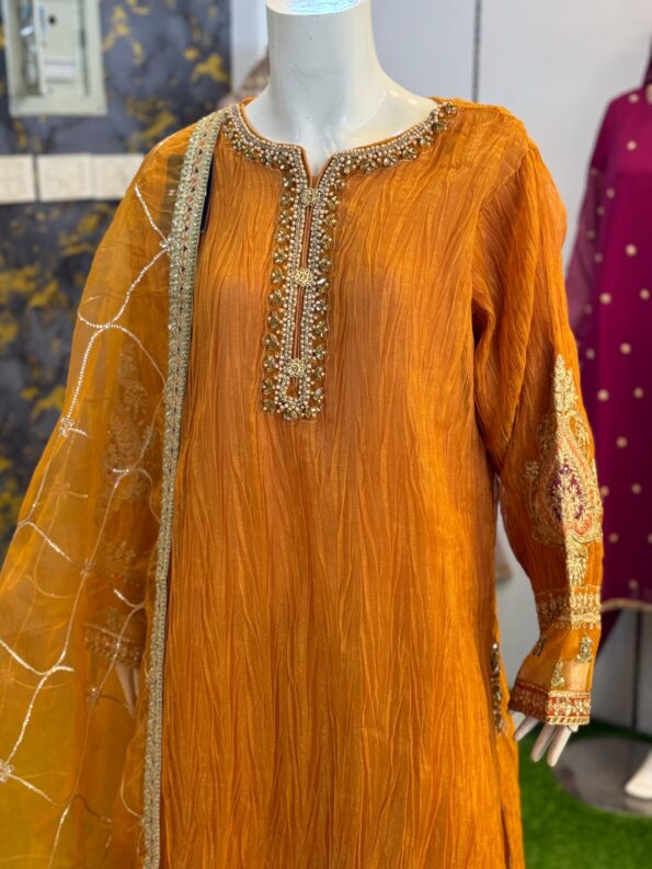Step into timeless grace with this exquisite amber-orange ensemble, crafted in rich crinkle fabric that flows effortlessly with every step. The neckline is beautifully adorned with intricate hand embellishments of beads and stones, adding a touch of luxury to its traditional charm. Delicate embroidery on the sleeves and hemline enhances its regal appeal, while the matching organza dupatta is finished with fine threadwork, sequins, and borders that elevate the entire look. Paired with straight trousers, this outfit is a perfect blend of classic tradition and modern sophistication — ideal for festive gatherings, formal occasions, or celebratory evenings where you wish to shine with understated elegance.